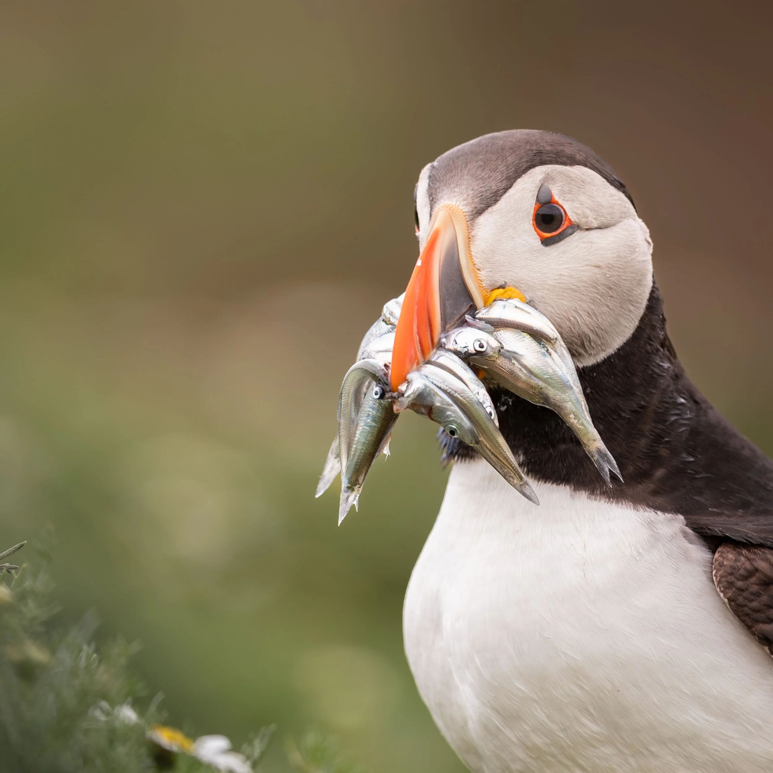 Classic image of a puffin with a beak full of sand eels. Canon 1DX MkII with Canon 500mm f4L IS II Lens. Exposure: 1/1250 | f5 | ISO 500